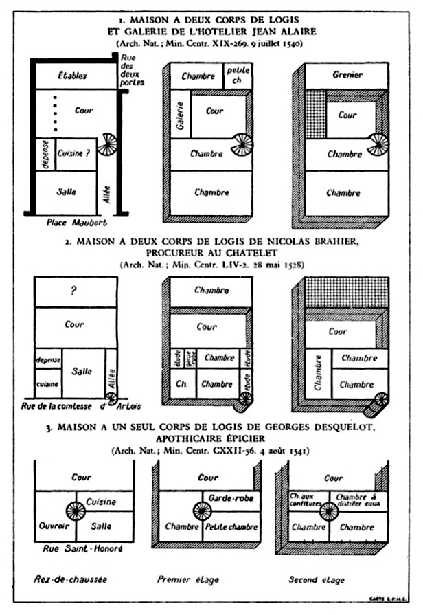 Входя в дом, вы попадаете в узкую прихожую с лестницей (allée на первых двух схемах), сбоку от нее зала (salle), служившая гостиной, столовой, кабинетом и т.п. Кухня (cuisine) тоже находится на первом этаже (rez de chaussée, цокольный этаж). На остальных этажах находятся комнаты, они же спальни (chambres), при этом они могут быть проходными (как на первых двух схемах) и кабинеты (études на второй схеме; заметьте, вполне может быть, что окон там нет в принципе). Сдавали комнаты совсем необязательно так, чтобы они сообщались, но вот на первой схеме как раз гостиница.