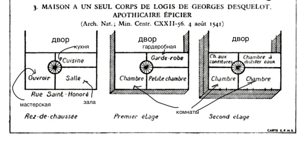 Это все та же третья схема (это дом аптекаря), но я ее подписал по-русски. Вход с улицы ведет прямо в лавку (иначе я не понимаю эту схему вообще). На втором этаже (по-французски он называется первым) имеется гардеробная (garde-robe; если в доме есть уборная, то скорее всего она там) и "маленькая комната", а на третьем - две "профессиональные" комнаты: для варений (confitures, не похоже, что это не про сладости, все-таки сахар тоже продавали именно в аптеке) и для дистилляции.