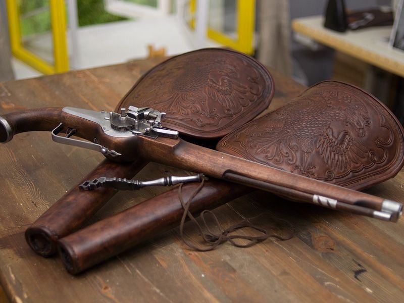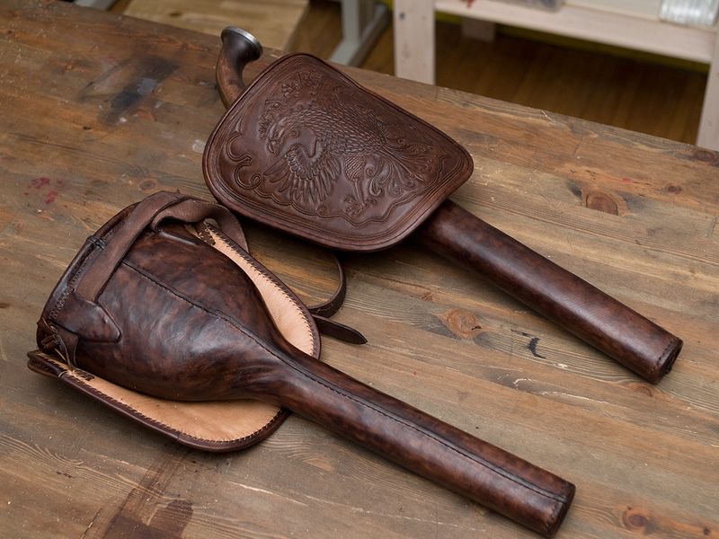 Спереди, более светлой кожи, похожее на футляр для дилдо - это седельная кобура, она же ольстер (на фотографии пистолет вставлен неправильно). К сожалению, их тоже сохранилось очень мало, но вот, посмотрите на имитации: