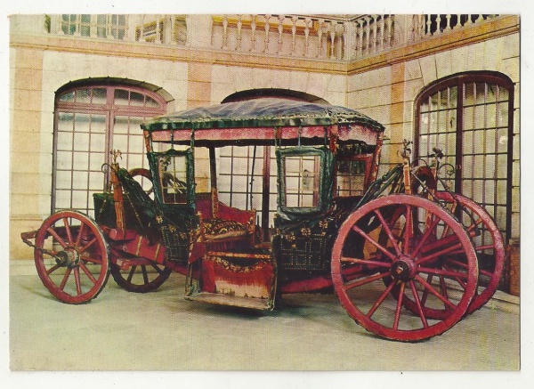 Вот тут она же с полезными комментариями на португальском. Я португальский не знаю, но гуглопереводчик подсказывает, что кучера здесь не было, правили форейторы, и что стенок тоже не было, только тяжелые драпировки. Под подушками сидений, если я правильно понял перевод, была дырка для отходов (может, стоял какой-то аналог ночного горшка, а может, и нет - не написано).